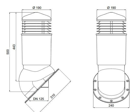 - Комплект вентиляционного выхода с проходным элементом для кровли из гибкой битумной черепицы (готовой). Изолированный (утепленный) вариант вентвыхода для предотвращения образования конденсата в зимний период.